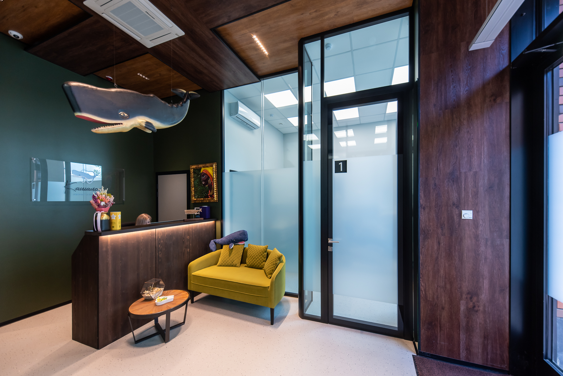 Они должны обеспечивать высокий уровень звукоизоляции и визуально сочетаться с интерьером. Так, например, двери и перегородки в стоматологии «Кашалот» выглядят как единое целое. Секрет в том, что двери модели Magic наша компания создала именно для систем Twin, поэтому они идеально сочетаются. А за счет того, что стеклянные панели соединяются ультратонким прозрачным профилем из поликарбоната, достигается эффект воздушности всей конструкции.