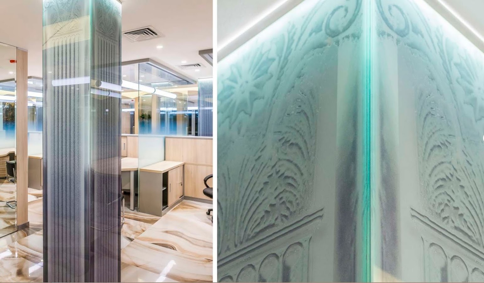 Актуальна облицовка колонн стеклом. На внутреннюю сторону стеклянного полотна путем фотопечати наносится рисунок, само стекло наклеивается на существующую колонну, и в результате скучный конструктивный элемент становится главной деталью интерьера.