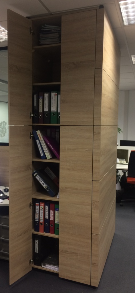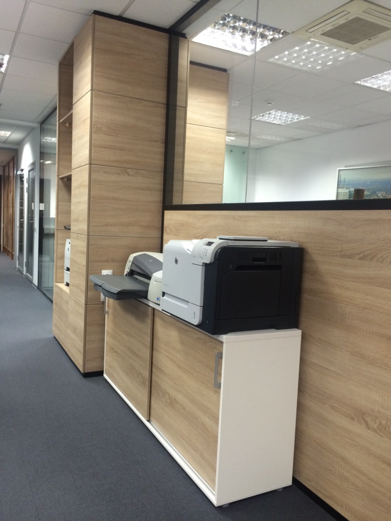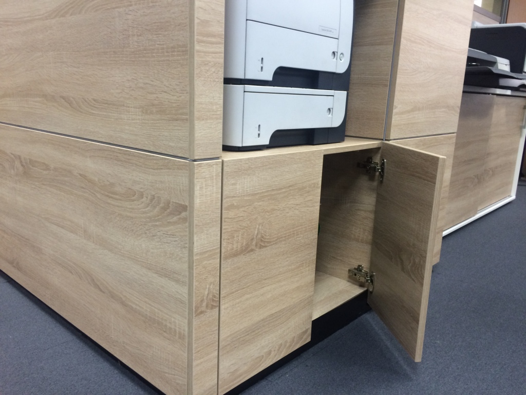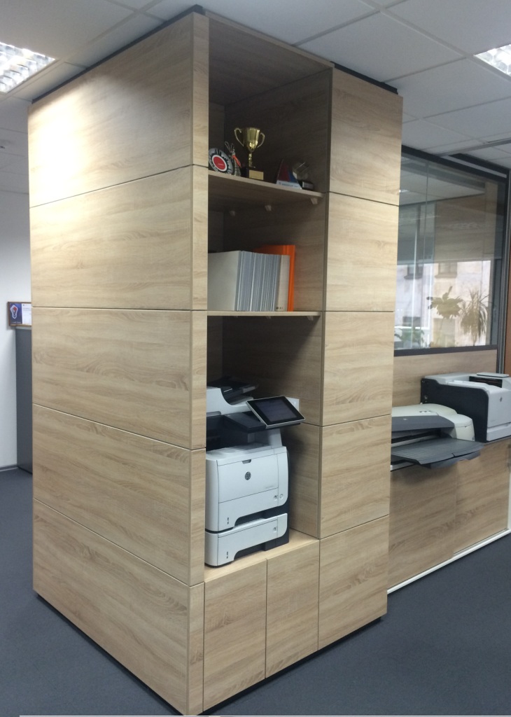 Дополнительный бонус такой облицовки - это использование колонны как основу для создания мест хранения и ниш под технику. В этом случае, колонна как бы "растворяется" в офисном пространстве.