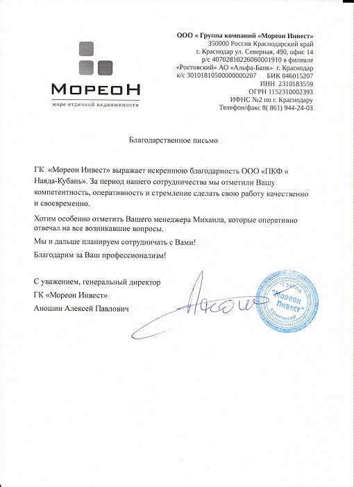 По итогам работы NAYADA-Кубань получила благодарственный отзыв от своего заказчика.