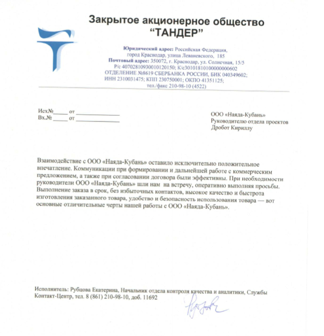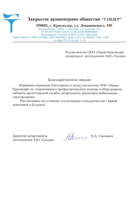 Спустя несколько месяцев после выполнения первого запроса, Тандер заключает очередной контракт на оборудование кабинетов диспетчерской службы департамента транспорта ЗАО "Тандер". На этот раз в качестве выбранной продукции NAYADA стали мобильные рабочие места для сотрудников. За качественную и оперативную работу было направлено благодарственное письмо от директора департамента эксплуатации ЗАО "Тандер".