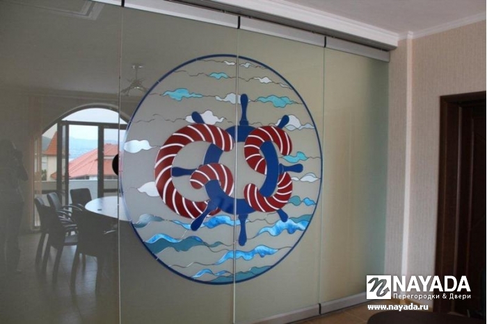 Нанесение логотипа компании на стекло методом нанесения витражных пленок (технология "псевдо-тиффани"). Художественную часть работы выполнили профессиональные художники - дизайнеры.