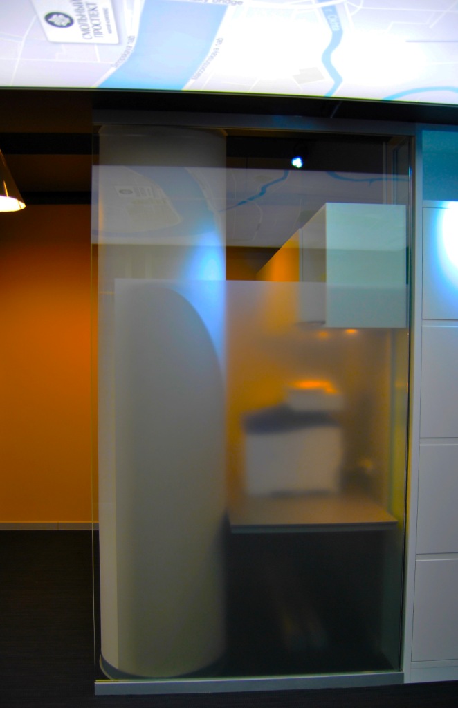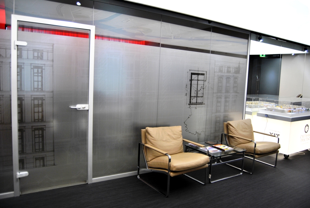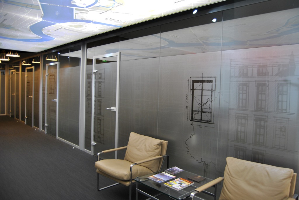 Дизайнер использовал оригинальное решение в оформлении помещения – дух строительства в каждой детали. В холле - яркий макет нового жилого комплекса, на потолке - подсвеченная карта Санкт-Петербурга, стеклянные перегородки – подчеркнуты строгими линиями дверных рам, и завершающий элемент – графический рисунок на стеклянных перегородках в виде эскизов и чертежей будущих зданий!