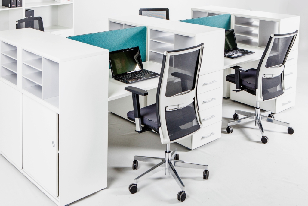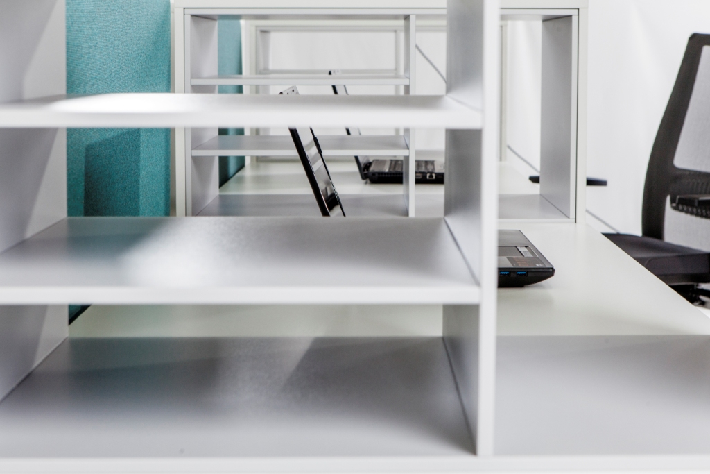 Рабочие места можно отделить высокими тумбами и модулями, которые одновременно являются и органайзерами для хранения документов.