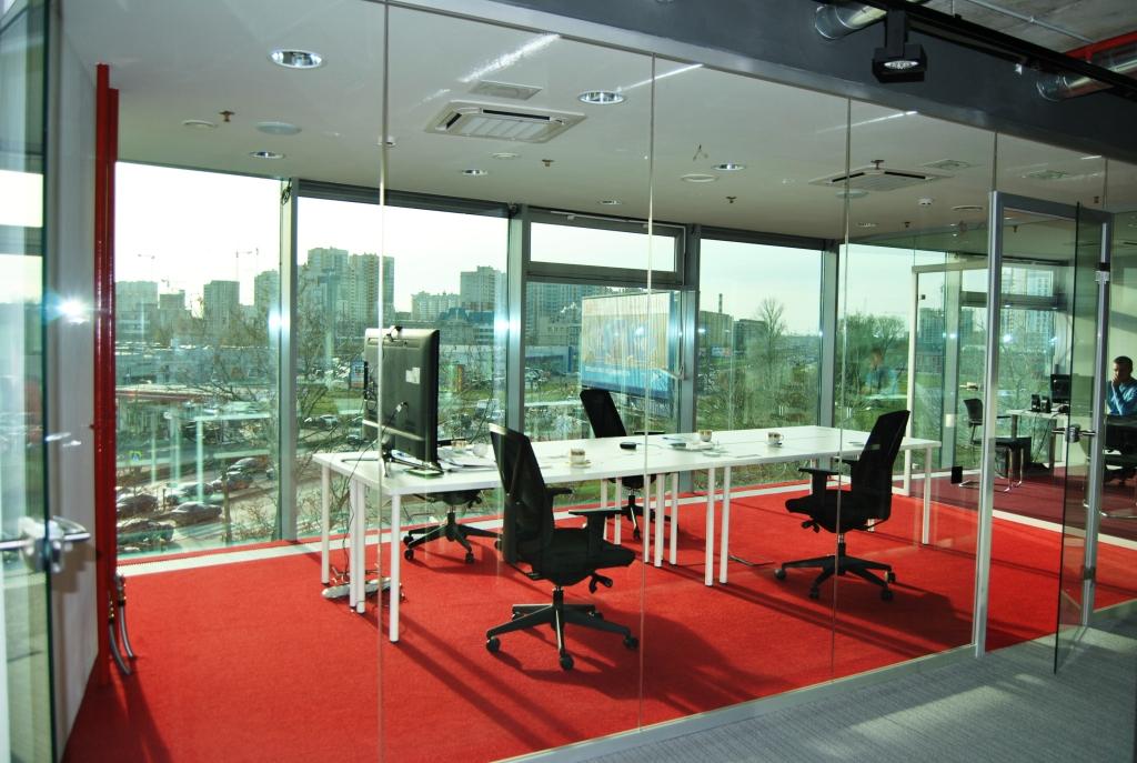 Цельностеклянные перегородки в сочетании с панорамными окнами наполнили офис МОНОПОЛИИ, площадью 1000 кв.м., солнечным светом и воздухом, а зажимной профиль из анодированного алюминия, дополнил эстетичный вид перегородок.
