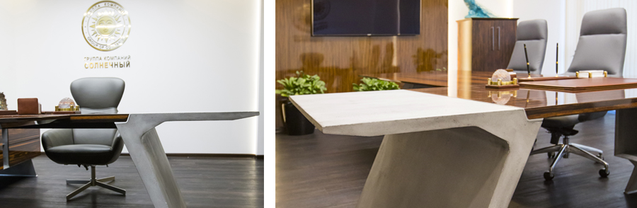 Стол руководителя из шпона макасар имеет глянцевую столешницу и матовые опоры, выполненные в легком бетоне.