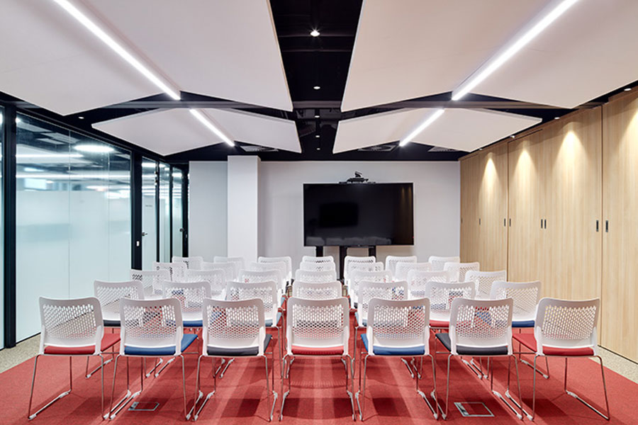Для каждой переговорной продумано индивидуальное решение, основанное на вариациях цвета и дизайна. В тренинг-комнате установлена акустическая трансформируемая перегородка NAYADA-SmartWall со степенью звукоизоляции 42 дБ.