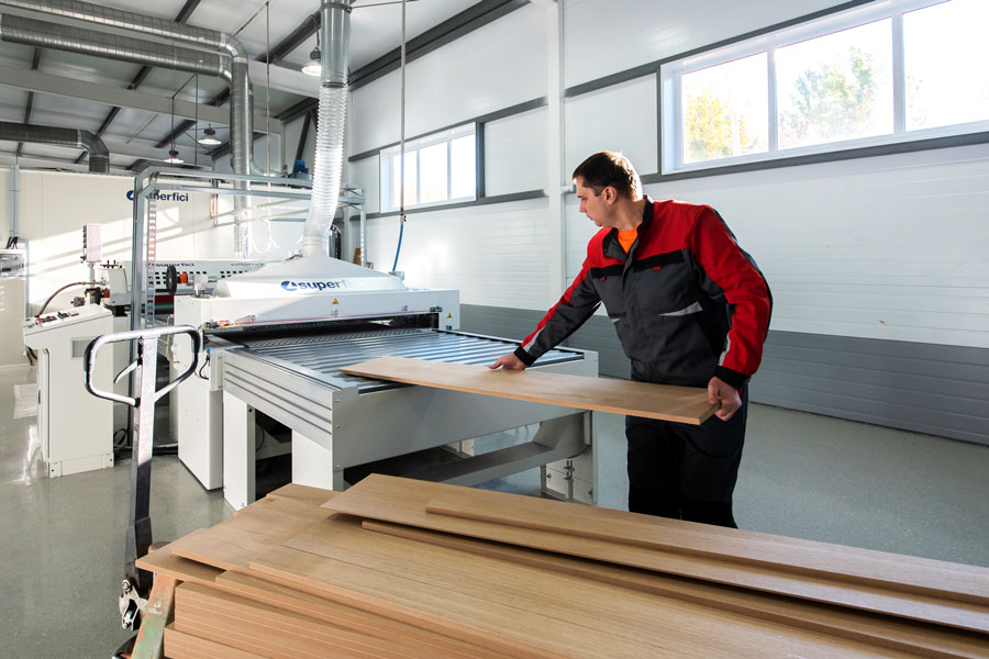 В состав новой линии входят: шлифовальный станок, три вальцовых станка для нанесения разных слоев лакокрасочных материалов с разным функционалом. После каждого вальцового станка установлена ультрафиолетовая (УФ) сушка для кристаллизации финишной отделки.