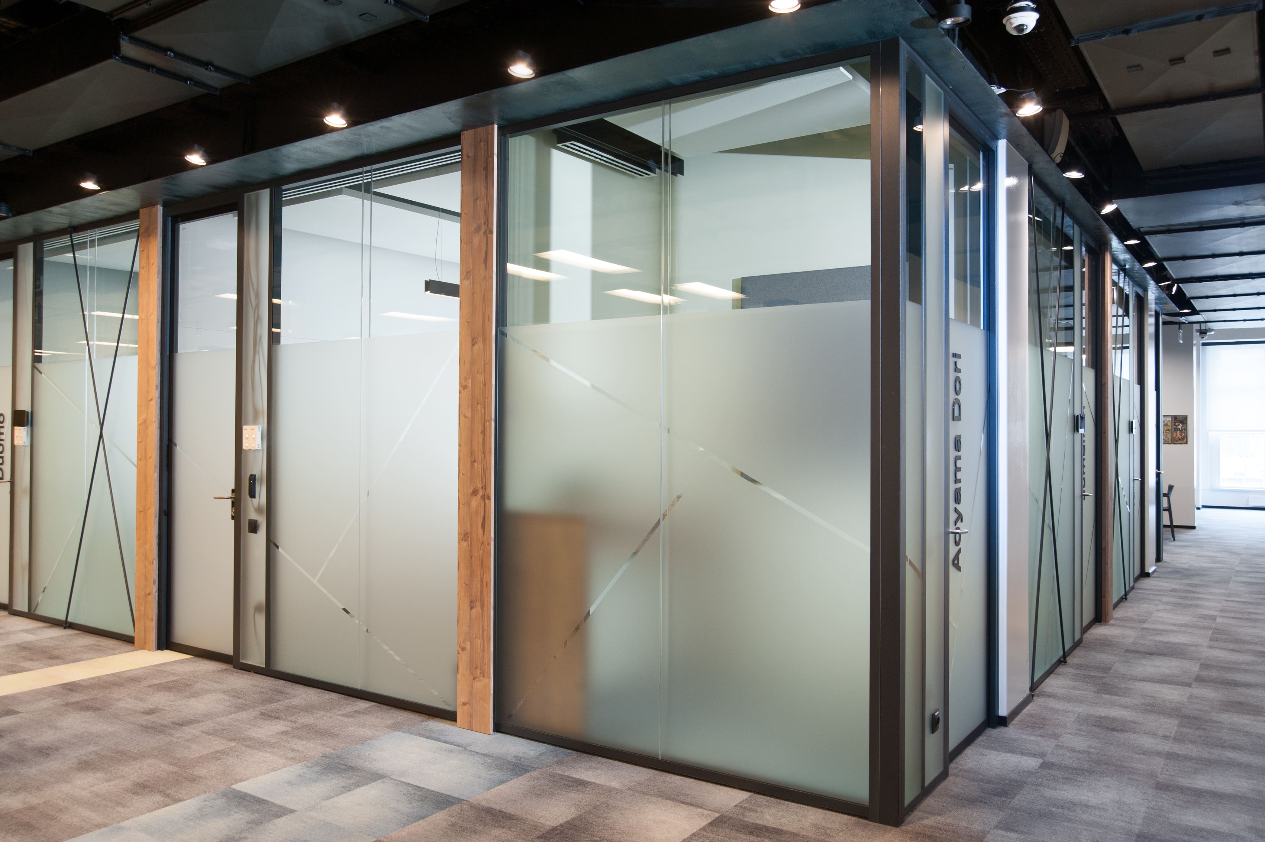 Переговорные и кабинеты, названные в честь главных мировых улиц, выполнены в «строгом», монохромном варианте. На видимом уровне перегородки матированы пленкой с геометрическим декором. Стиль лофт подчеркиваются черным профилем Sahara Black. В сочетании с бетонным потолком и стенами переговорные настраивают на сосредоточенность. Во всем офисе использованы достаточно сдержанные, «натуральные» цвета: множество оттенков серого, коричневого, приглушенного синего с добавлением ярких акцентов.