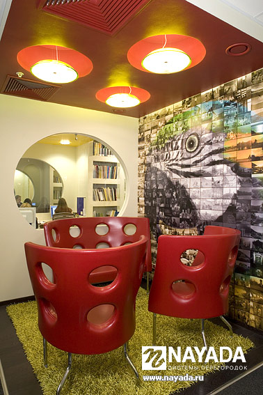 Интерьер рабочей зоны компании построен на контрасте округлых и прямых форм, матовых шероховатых стен с гладкими и прозрачными поверхностями. Особый интерес вызывает сам подход к созданию комбинированных перегородок, в которых отсутствуют прямые линии, между глухой и прозрачной частями. Дизайнер проекта использовал гипсокартонные офисные перегородки со своеобразным большим экраном в форме незавершенного круга, в который вмонтирована перегородка NAYADA-Crystal. Для реализации этой идеи специалисты NAYADA предложили использовать точечное крепление цельностеклянной перегородки к проему, что делает композицию более эстетичной, а также позволит, в случае необходимости, легко заменить стекло. Для усиления звукоизоляции между стеклом и проемом проложена специальная силиконовая прокладка. Игру форм дизайнер продолжает и за счет использования прямоугольных цельностеклянных дверей, примыкающих к овальным проемам. Специально созданная NAYADA дверная рама создает оптимальный притвор и увеличивает звукоизоляционные характеристики конструкции. Желая обыграть идею круга максимально, автор проекта использовал ее также для декорирования стен, дверей и даже элементов мебели.