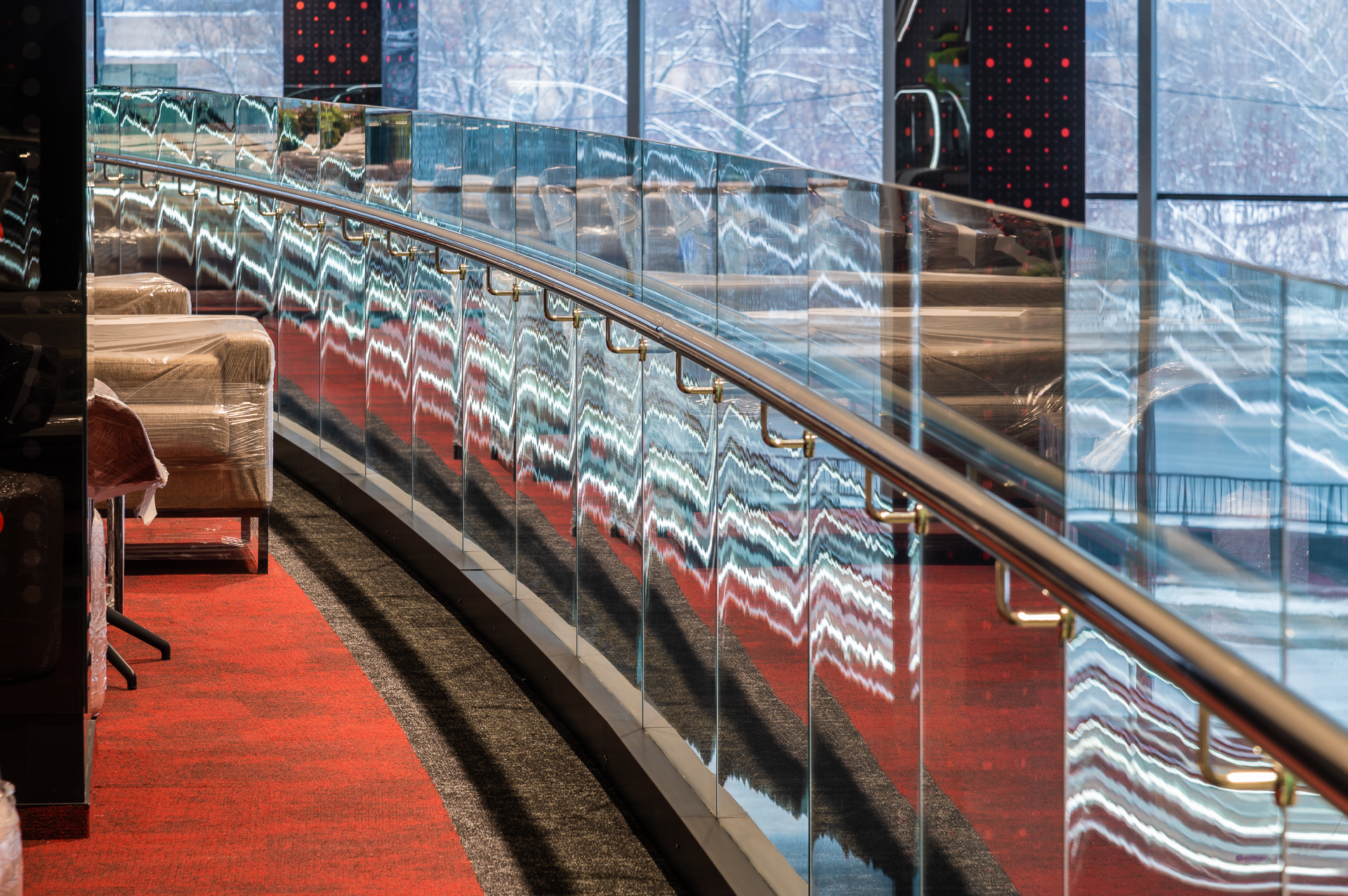 Он применялся для ограждения балконов и галерей и около эскалаторных зон. Была установлена несущая закладная рама из стали с посадочными местами для крепления триплекса и декоративного карниза с круглыми поручнями из нержавеющей стали, который крепится к триплексу точечным креплением для стекла.