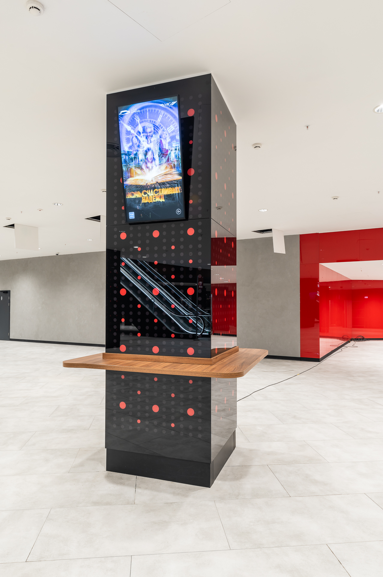 Было произведено остекление колон: изначально круглым в сечении колоннам с использованием металлического каркаса и листов гипсокартона придавалась прямоугольное сечение, а сами листы закаленного стекла наклеивались на гипсокартон.