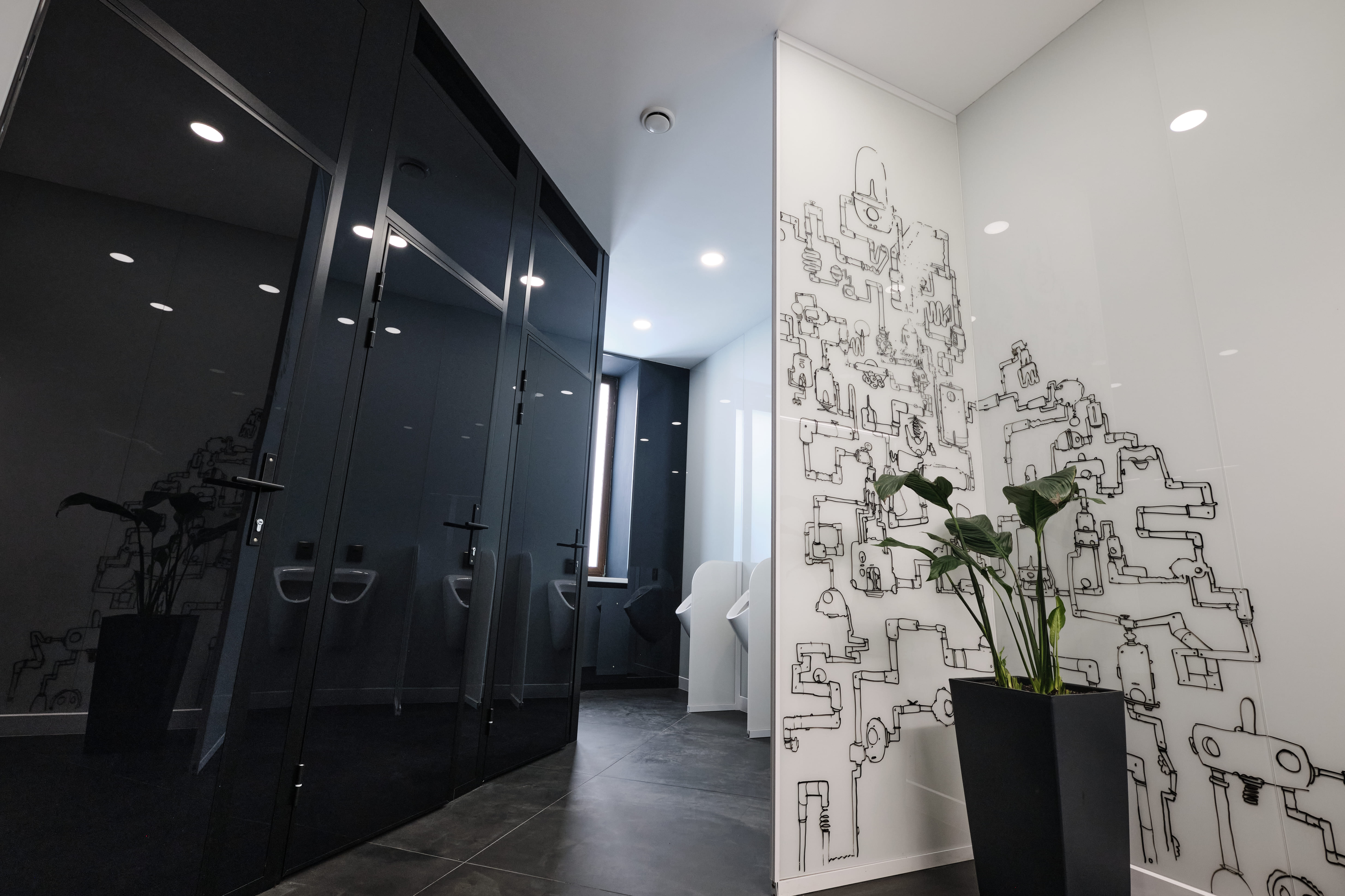 Особенные черты проекта «Школа 21» - строгость и элегантность графики и форм, стиль создаваемый черными перегородками и белым глянцем стен, блеск стекла и даже ковровое покрытие с тематическим узором «код матрицы». Все составляющие интерьера подобраны таким образом, что он выглядит уместно и соответствует окружающей рабочей обстановке.